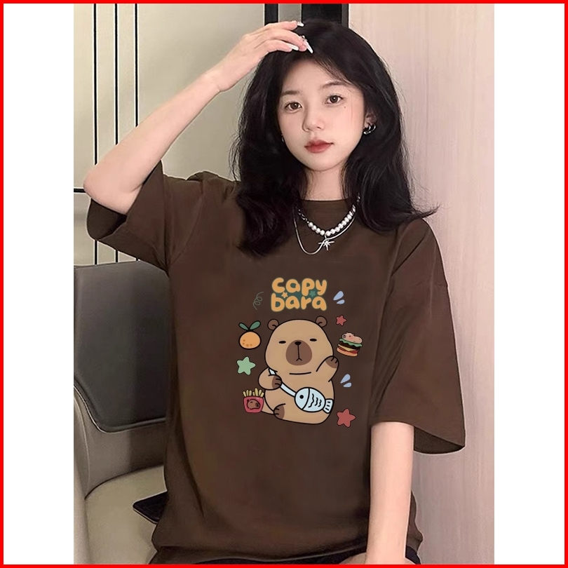Ihkke Kaos Oversize Wanita Korea Style Kartun Lucu Capybara Motif Printed Kaos Cream Import Premium Kaos Tebal Kaos Rema