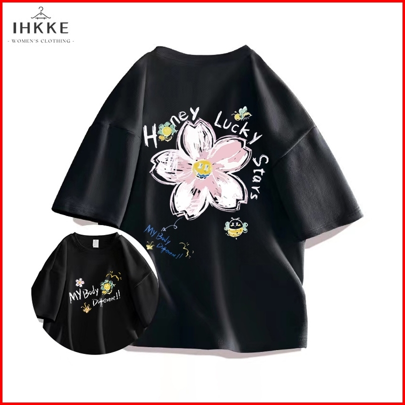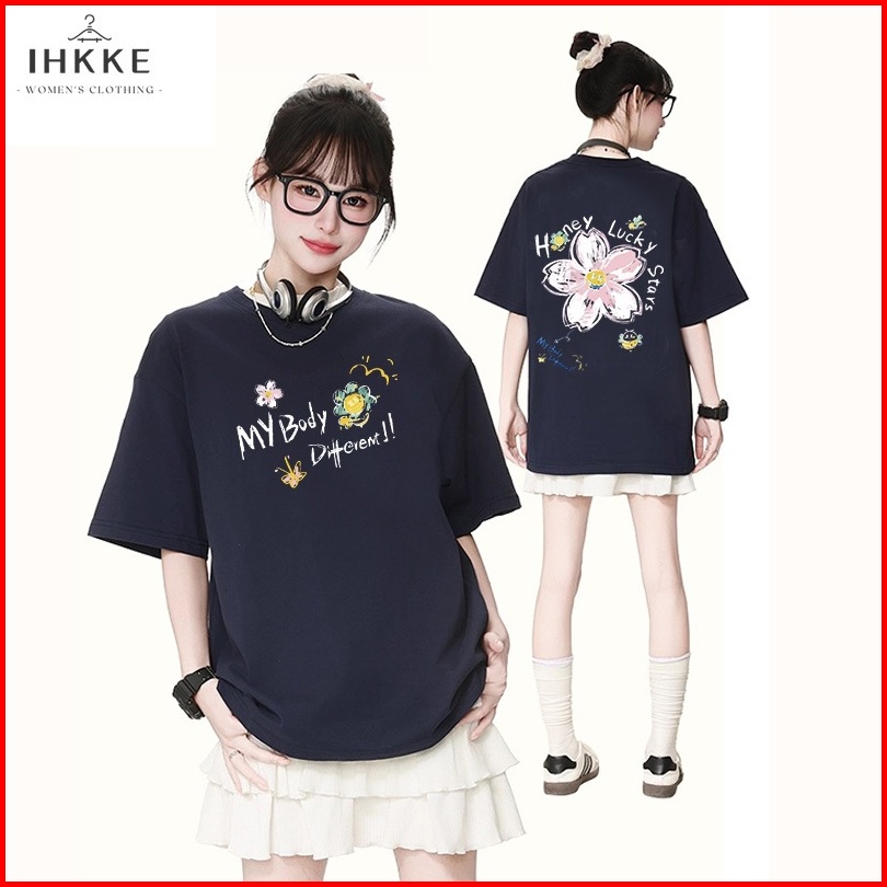 Ihkke Kaos Wanita Oversize Korea Style Blooming Flowers Sakura Graffiti Navy T Shirt Kaos Motif Bunga Kaos 24s Cotton Co