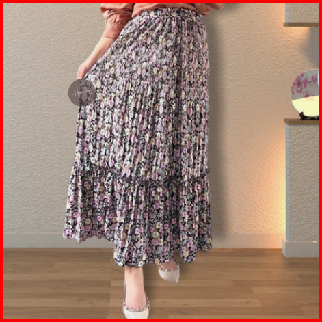 Haseena Rok Plisket Mietaa Rempel Susun Motif Klasik Bunga Kertas Skirt Ruffle Anti Nerawang