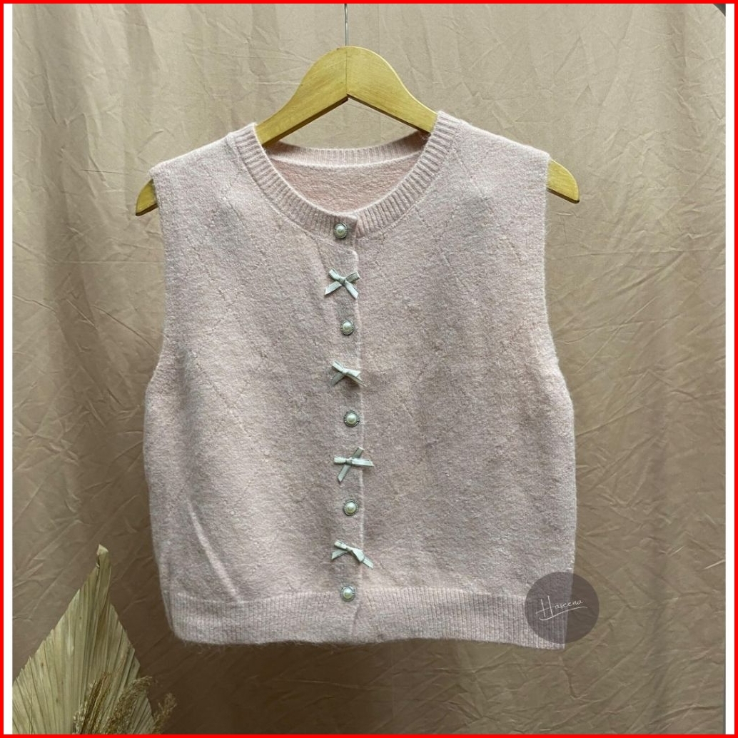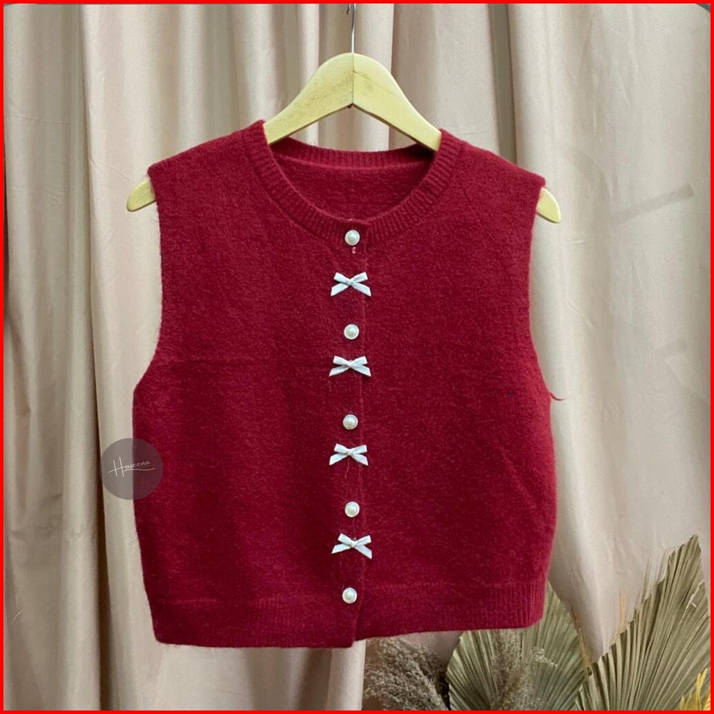 Haseena Vest Knit Izma Rompi Kancing Mutiara Pita Simpel Round Neck Outer Rajut Halus