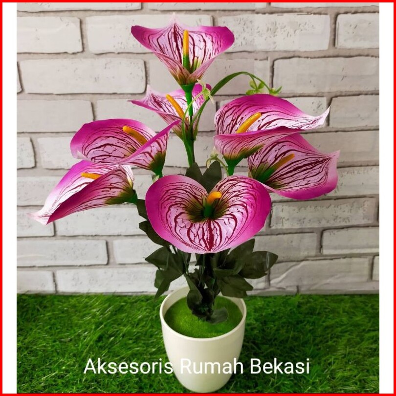 Set Bunga Plastik Anthurium Bunga Lilly Bunga Aron Panda Dengan Pot Lumut Melamin Bulat
