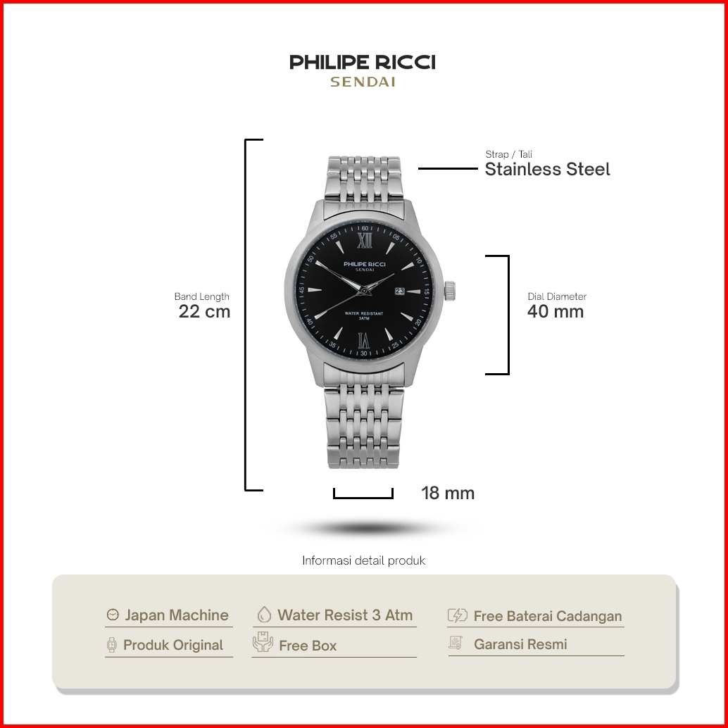 Philipe Ricci Sendai Jam Tangan Pria Rantai Stainless Steel Water Resist Original 6480r Men Watches
