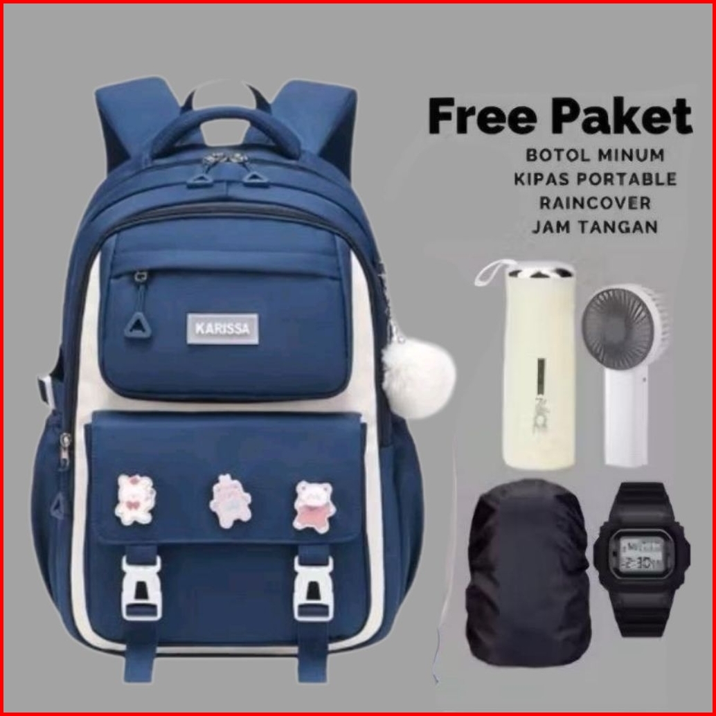 Tas Ransel 5in1 Kharissa Ransel Anak Sekolah Perempuan Sd Smp Sma Free Botol Minum Jam Raincover Kipas