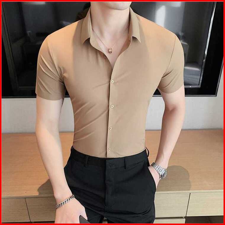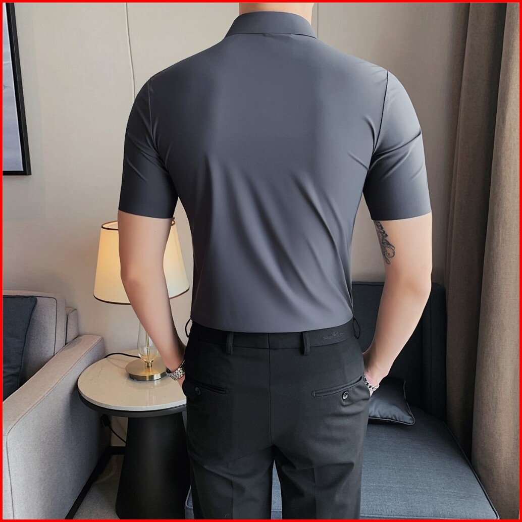 Kemeja Pria Lengan Pendek Polos Slimfit Kasual Bahan Katun Elastis Super Stretch Warna Htam Abu