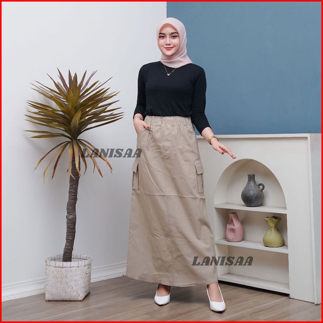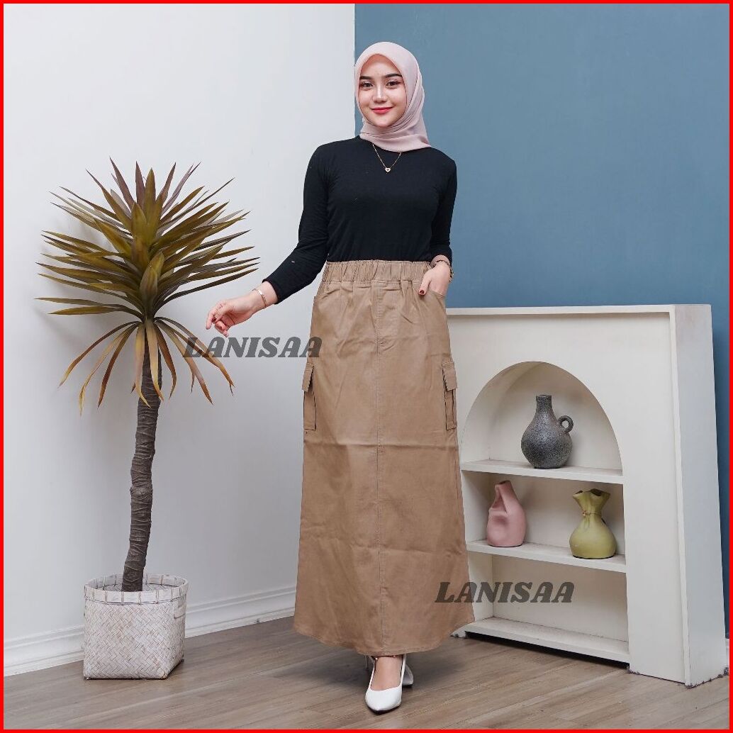 Rok Cargo Panjang Wanita Model A-line Rok Cargo Pinggang Full Karet Rok Wanita Kekinian