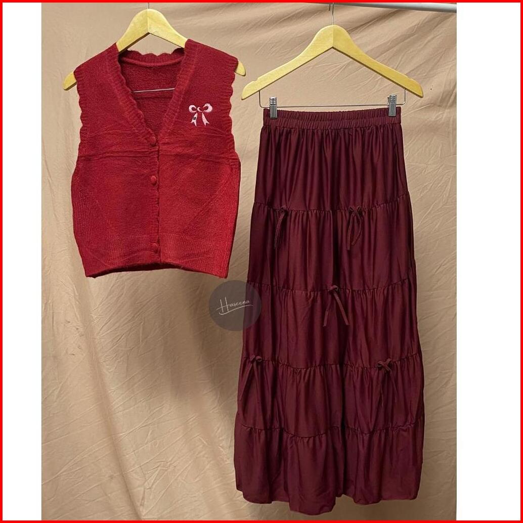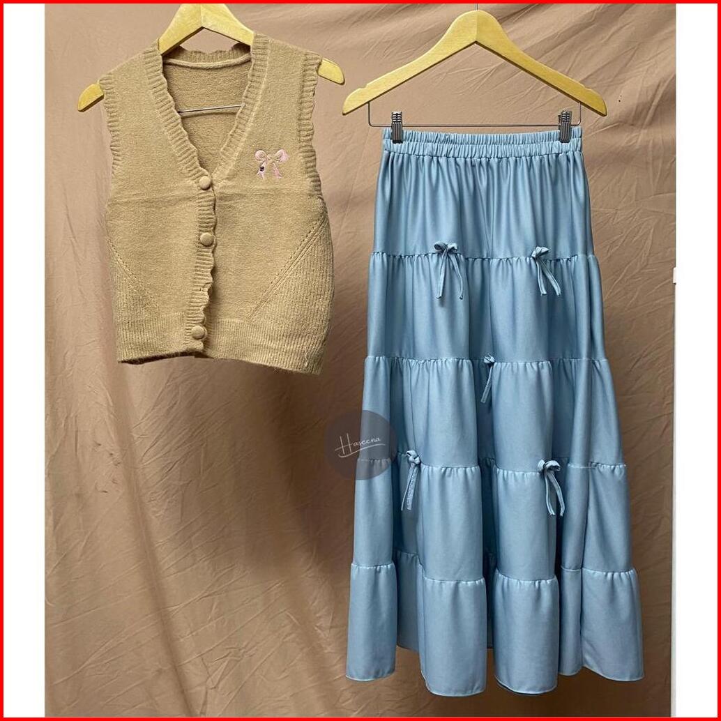 Haseena One Set Wanita Nayya Setelan Vest Knit Pita Basic Rok Susun Pita Long Ribbon Skirt Coquette Set
