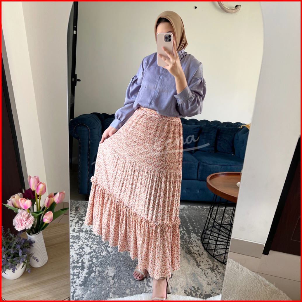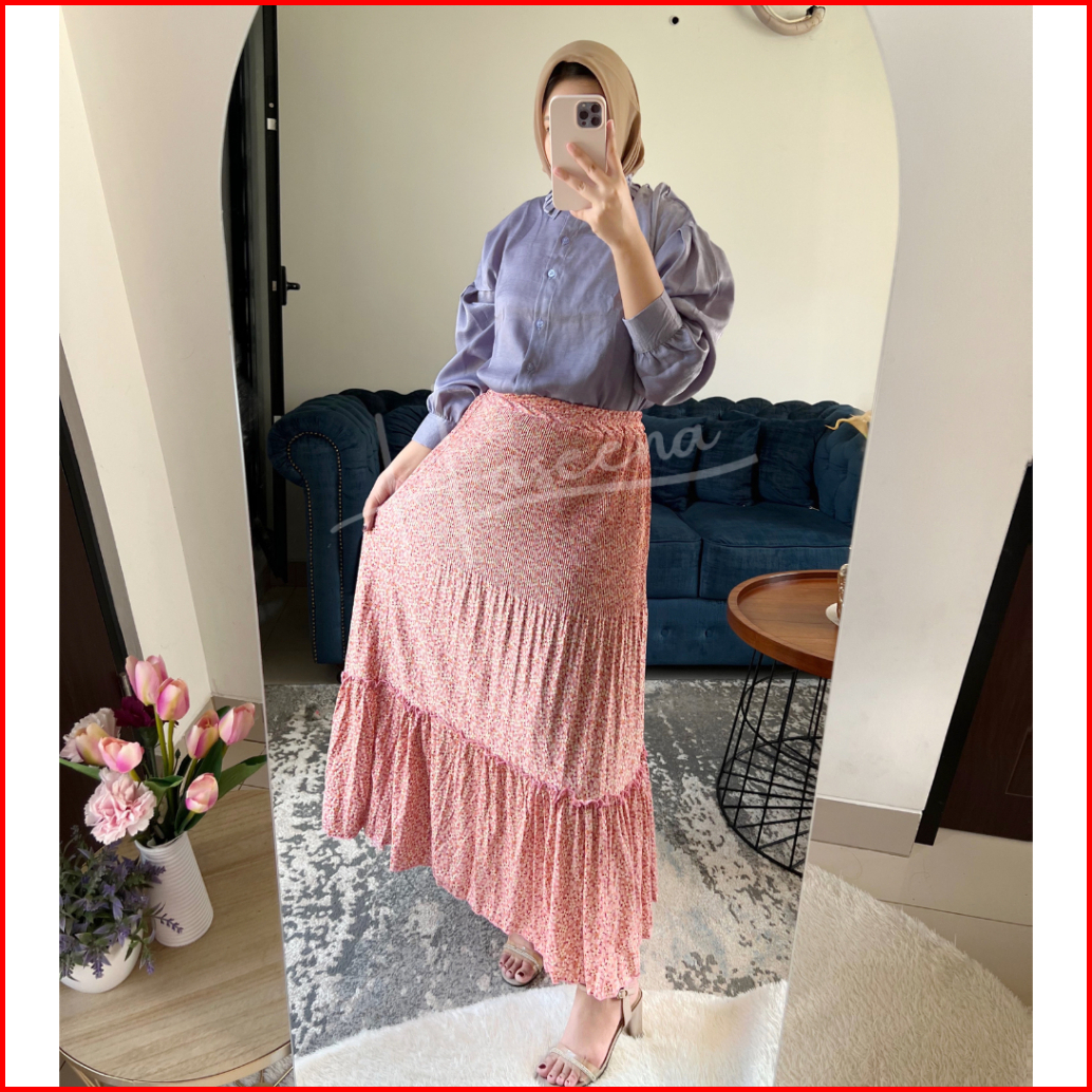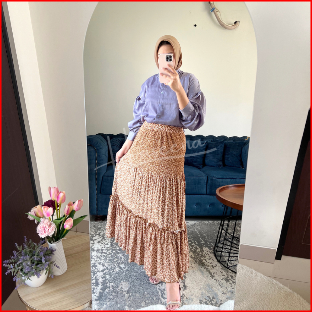 Haseena Rok Plisket Mietaa Rempel Susun Motif Bunga Kamboja Bawahan Wanita Muslim