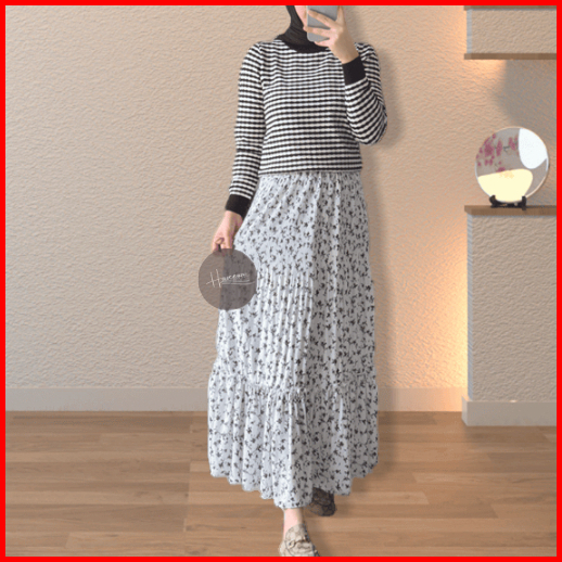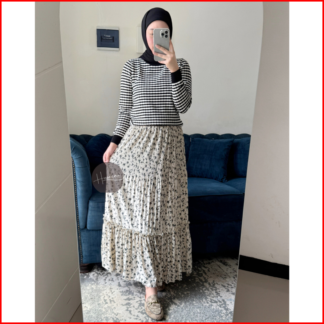 Haseena Rok Plisket Rempel Mietaa Motif Bunga Fresia Skirt Ruffle Bawahan Wanita Muslim Panjang