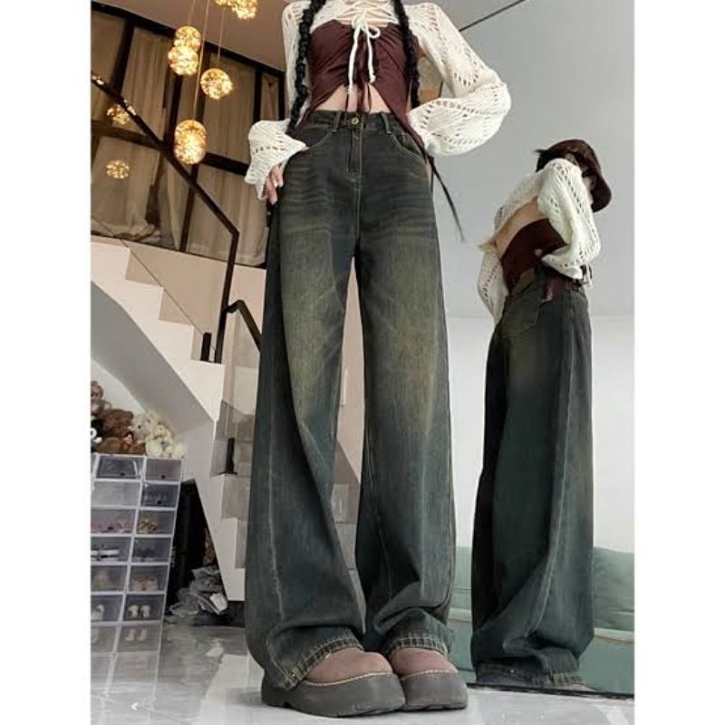 Raline - ( UNISEX ) Jeans Baggy Wanita Whisker High Waist Weekend Retro | Celana Jeans HighWaist Baggy Loose Gombrong Retro