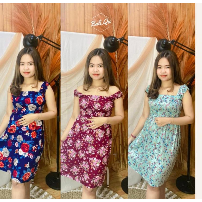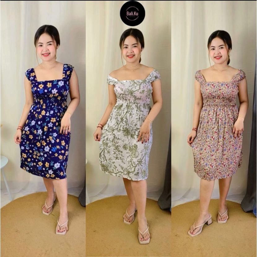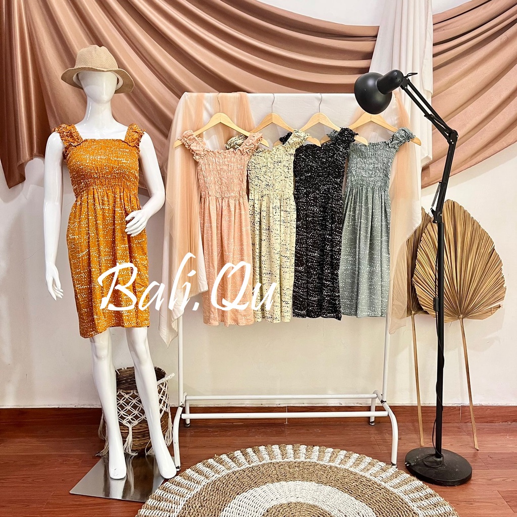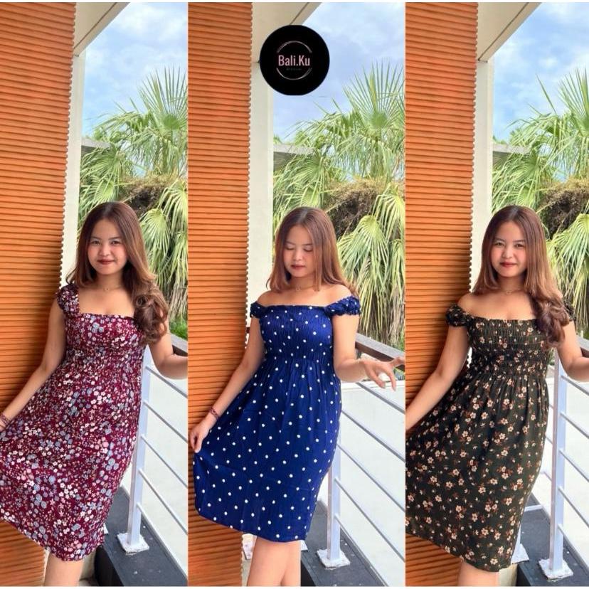 Dress Midi Kerut Bali Warna Motif Bunga Polkadot