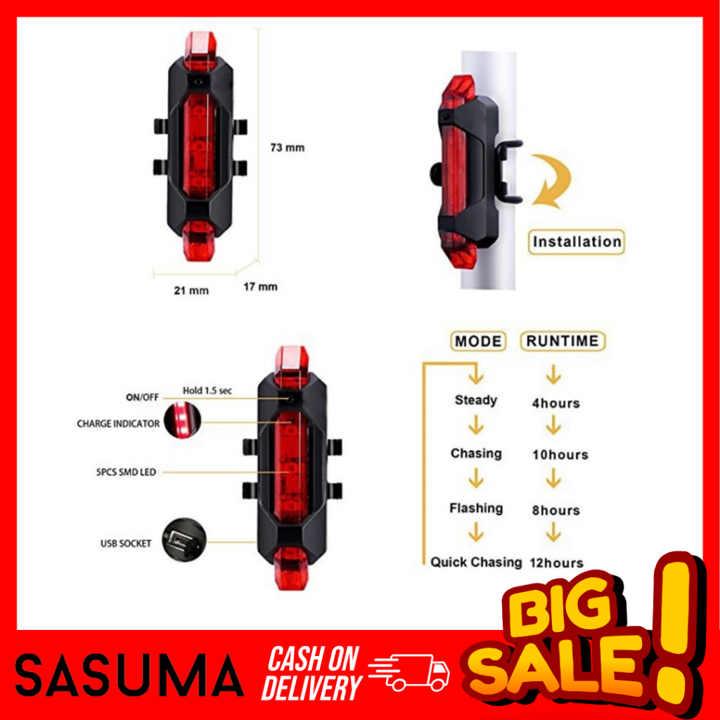 SASUMA Lampu Belakang Sepeda LED USB Rechargeable Anti Air Lampu Sepeda USB+Kabel cash