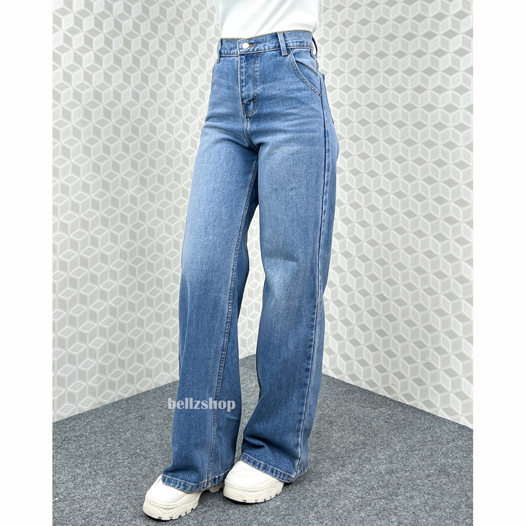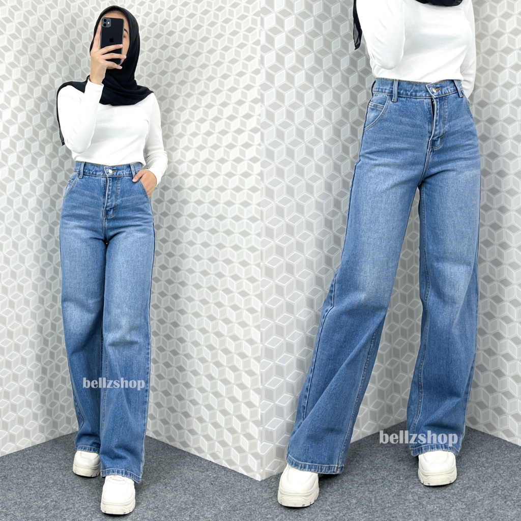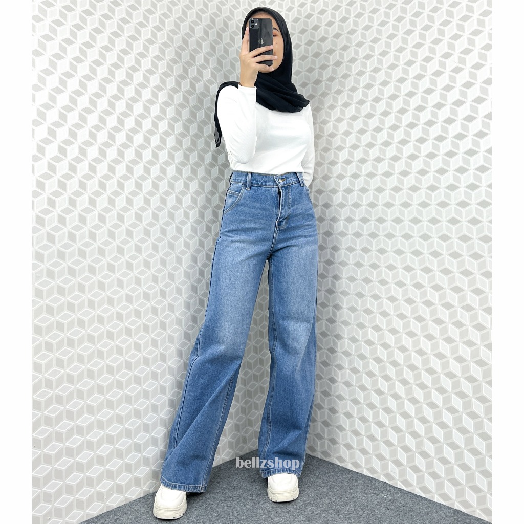 Celana Kulot Highwaist Jeans Panjang Wanita Tebal Tint Whisker Premium Bellzshop Sachi Size S-XXL