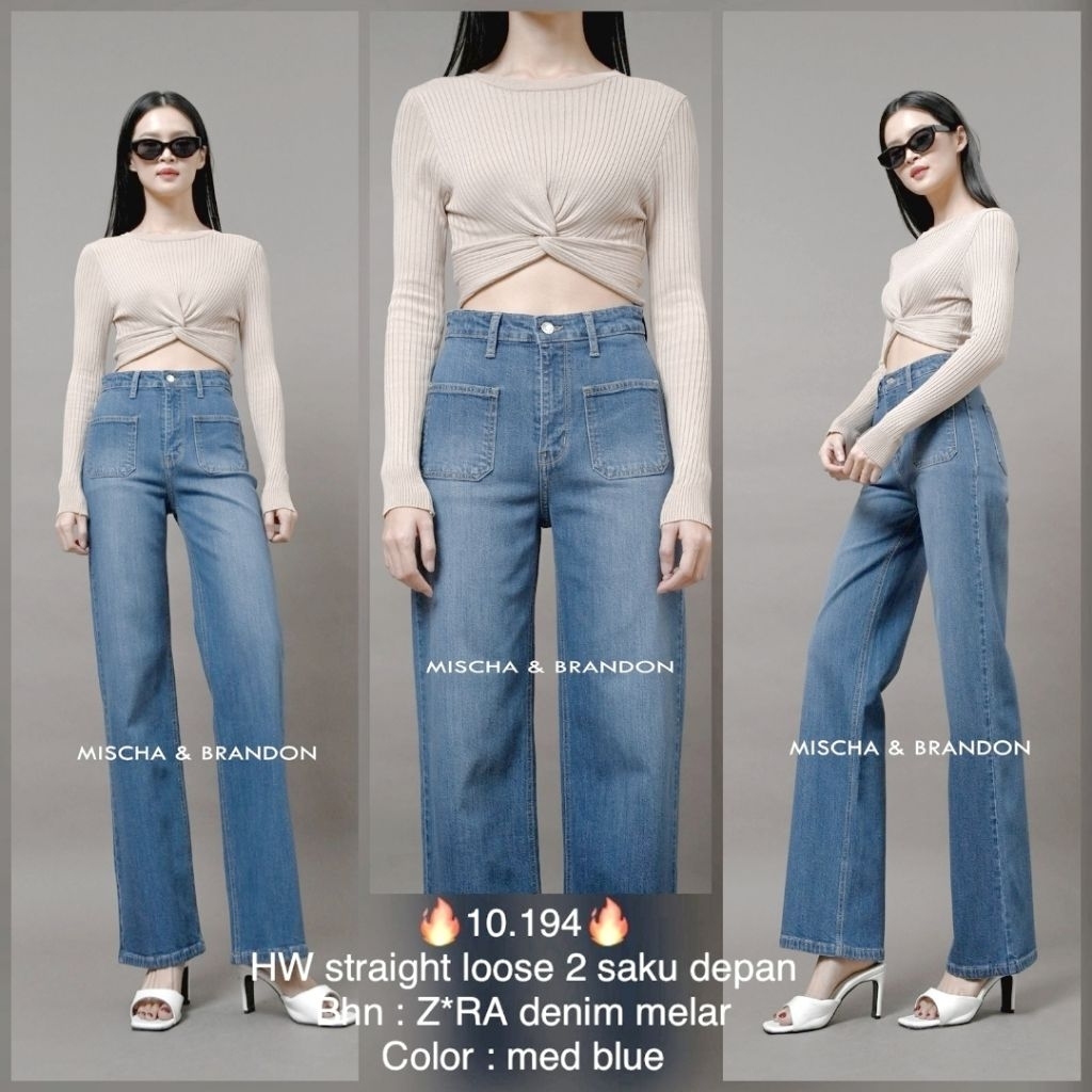 M&B Jeans Celana Panjang Wanita Jeans Stretch HW Straight Loose 2 Saku Depan Denim Melar