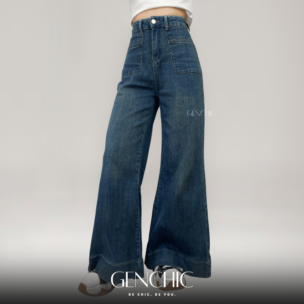 GENCHIC - Patch Pocket Wide Leg Jeans High Waist Oversized Culotte Jeans | Celana Jeans Kulot Wanita
