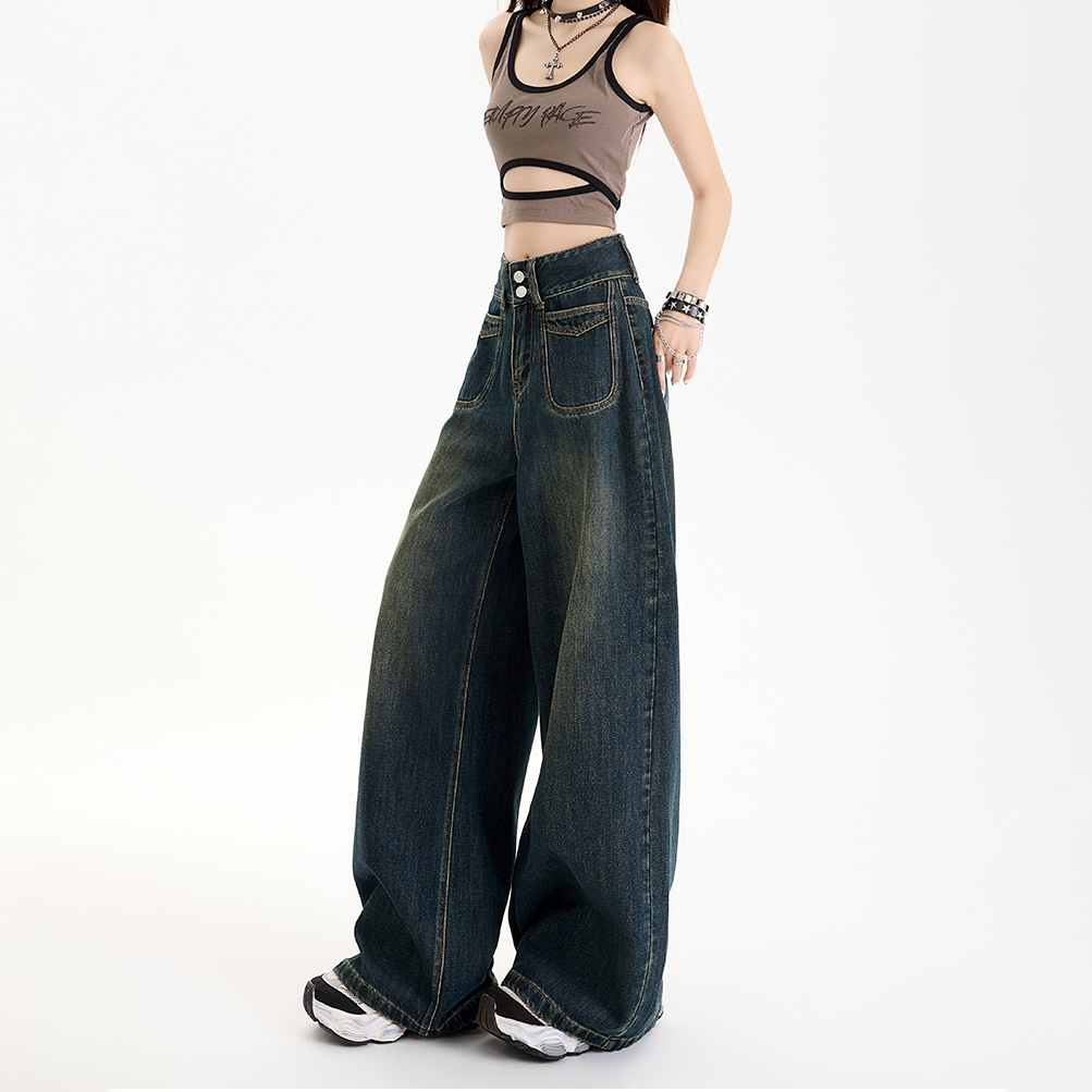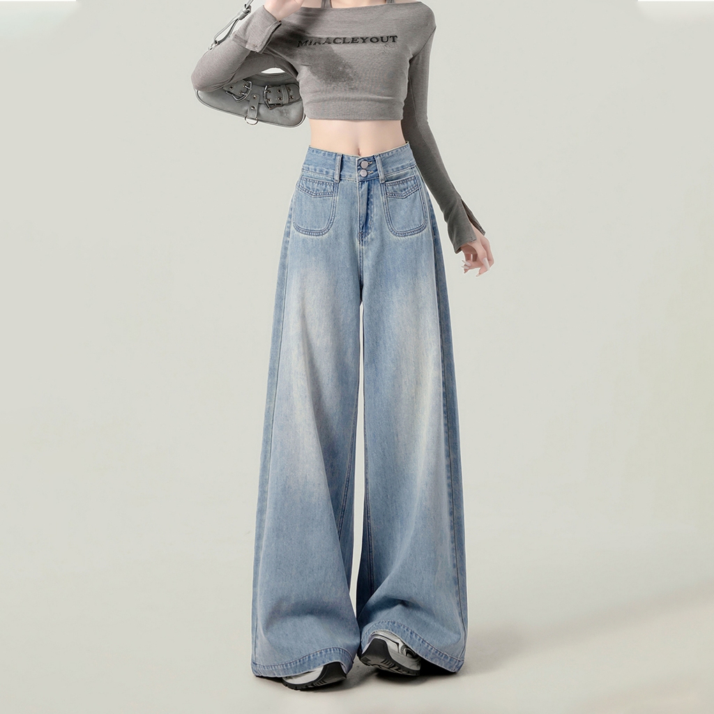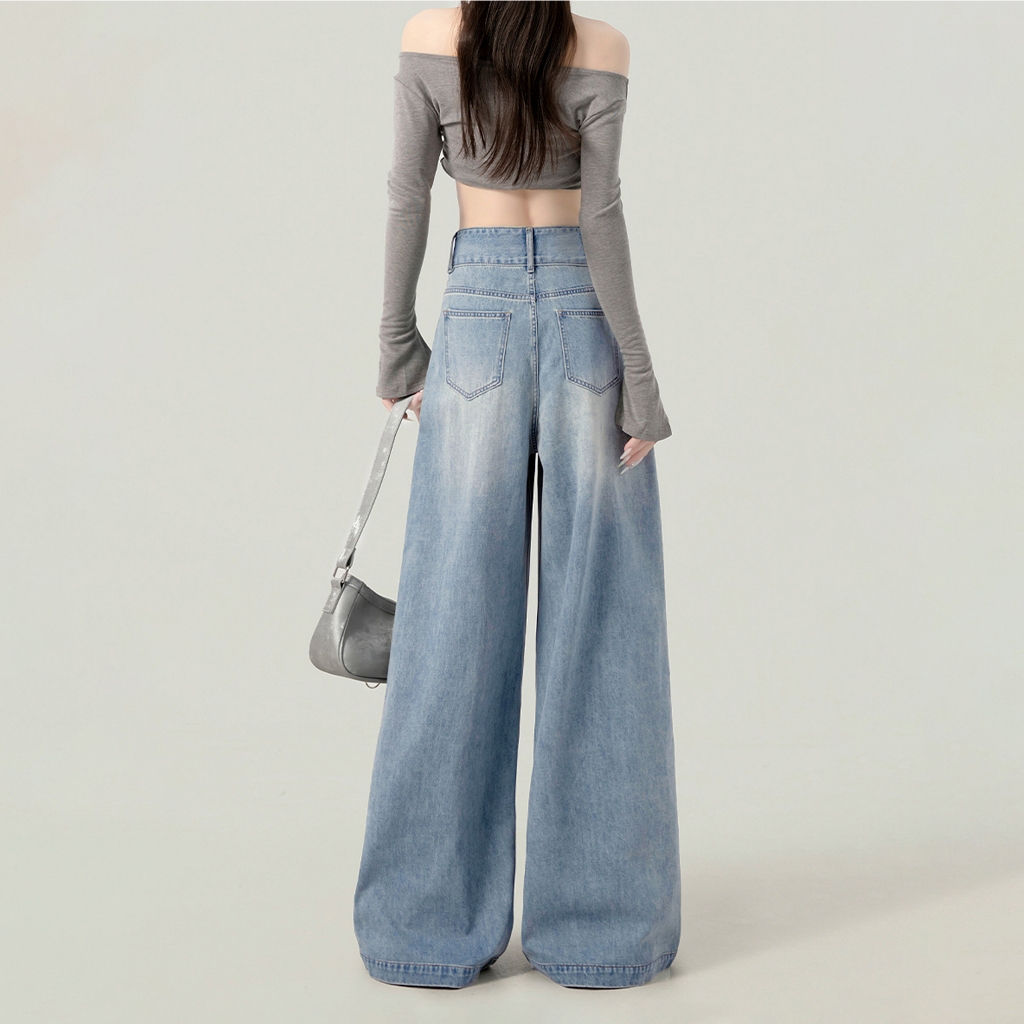 Stok Siap-Highwaist Jeans Wanita Celana Kulot Denim Celana Panjang Wanita Celana Baggy Jeans OOTD