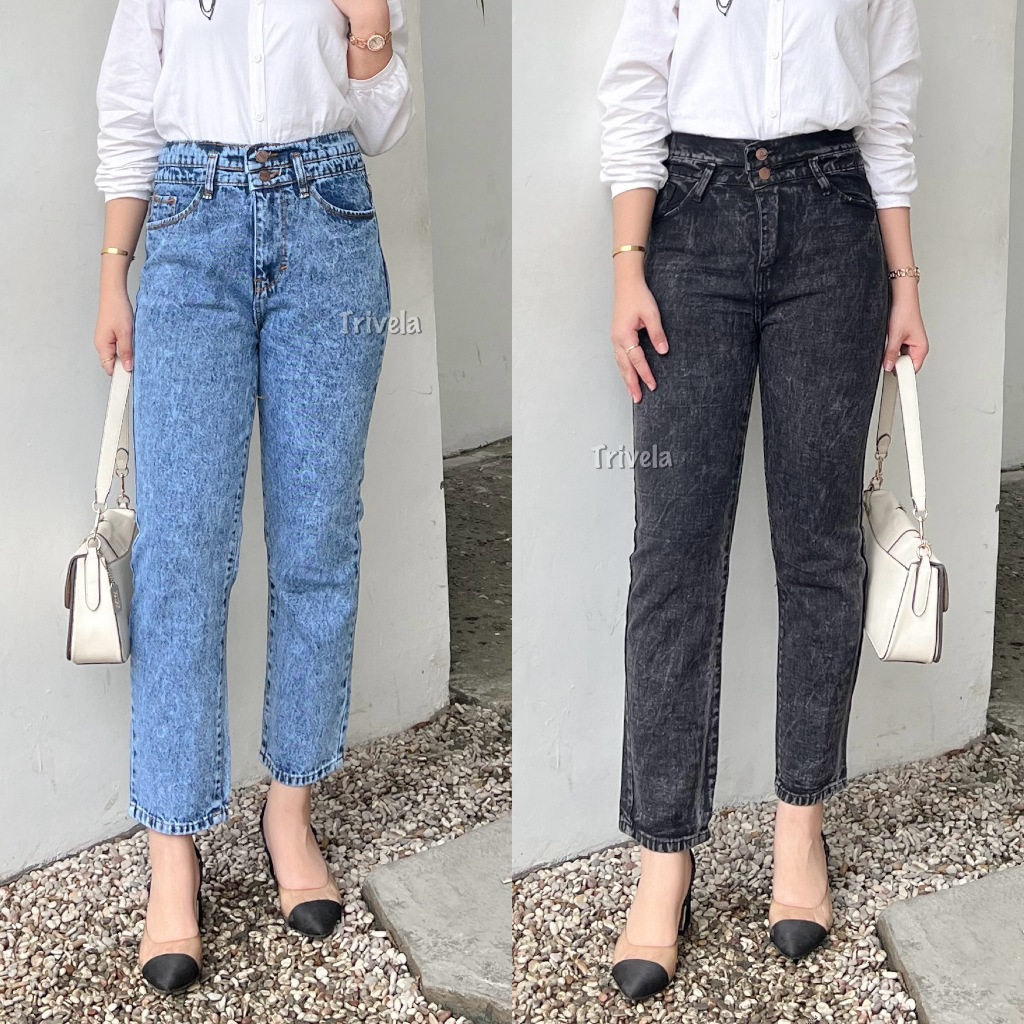 TRIVELA - Celana Jeans Boyfriend 2 Kancing / Celana Jeans Wanita Highwaist Snow / Celana Jeans Wanita Korean Style NEVILLE