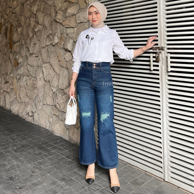 TRIVELA - Erica Cullotes Sobek Lapis | Kulot Jeans Ripped Hijab Friendly 27-42 | Jeans Wisker Wanita Highwaist Washed 27-34 / PLAINBF