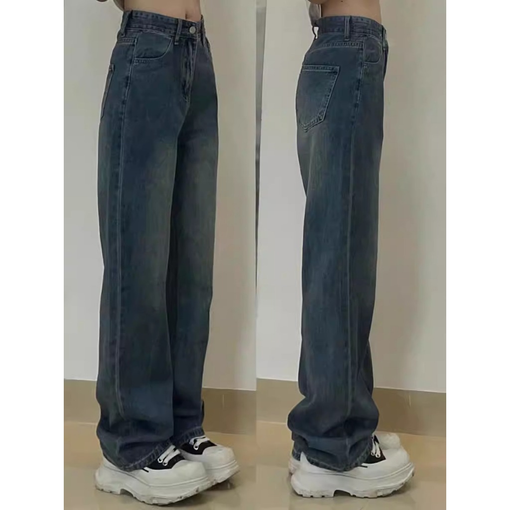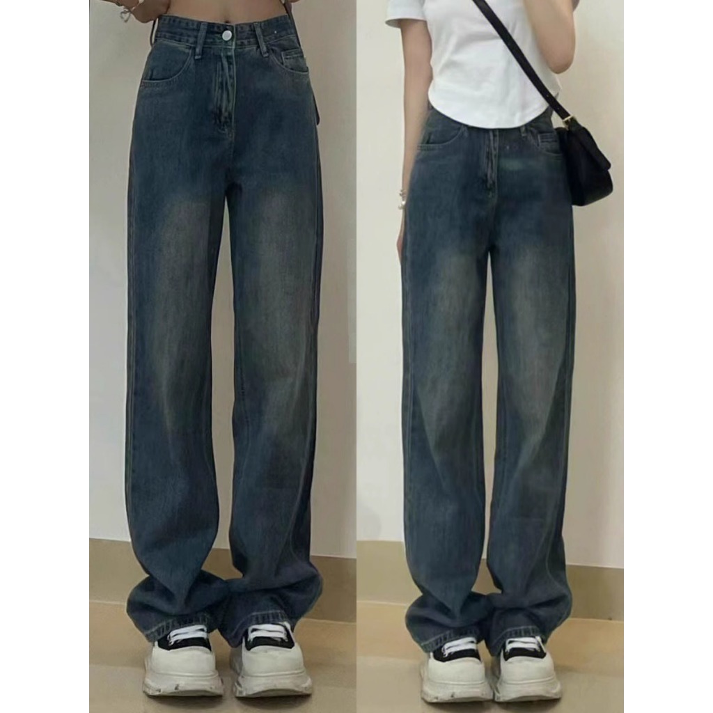 Biru retro Celana jeans wanita Premium Celana jeans lurus longgar ala Korea