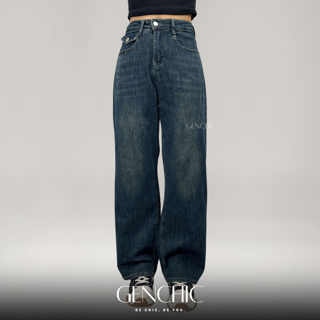 GENCHIC - Side Flap Pocket High Waist Jeans Loose Straight Leg Jeans | Celana Jeans Panjang Wanita