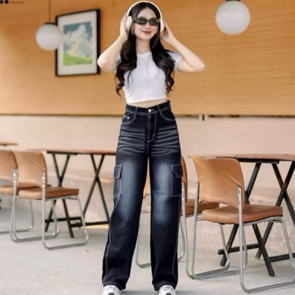 HighWaist Baggy Cargo Loose Jeans Retro Whisker - Celana Cargo Jeans Wanita Unisex