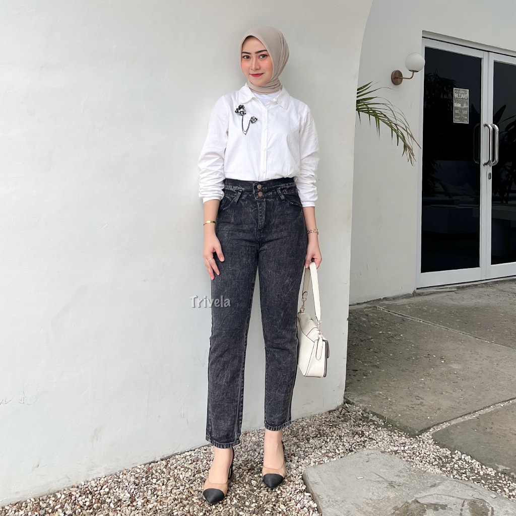 TRIVELA - Celana Jeans Boyfriend 2 Kancing / Celana Jeans Wanita Highwaist Snow / Celana Jeans Wanita Korean Style NEVILLE