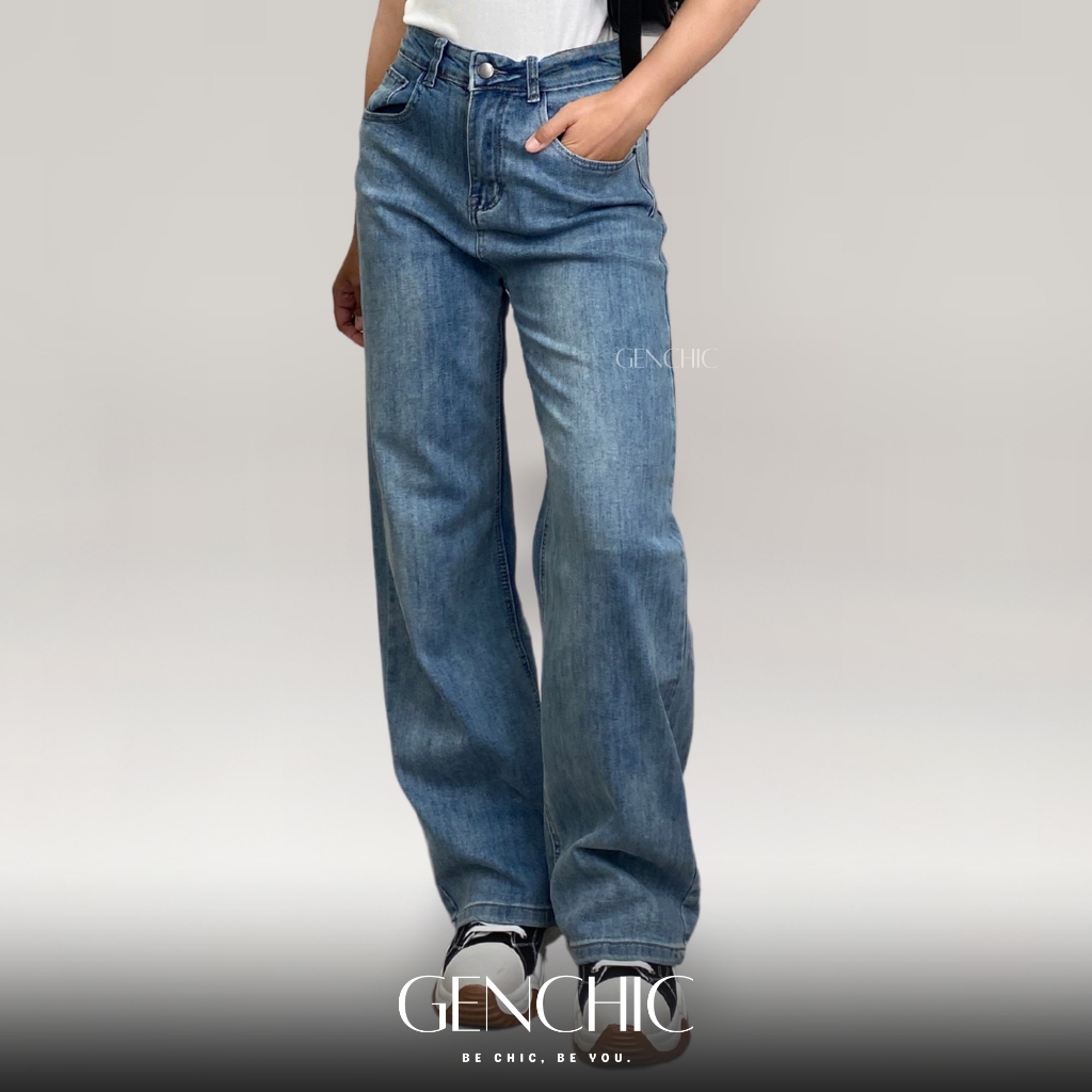 GENCHIC - High Waist Retro Jeans Loose Straight Leg Jeans Classic Denim Celana Jeans Panjang Wanita
