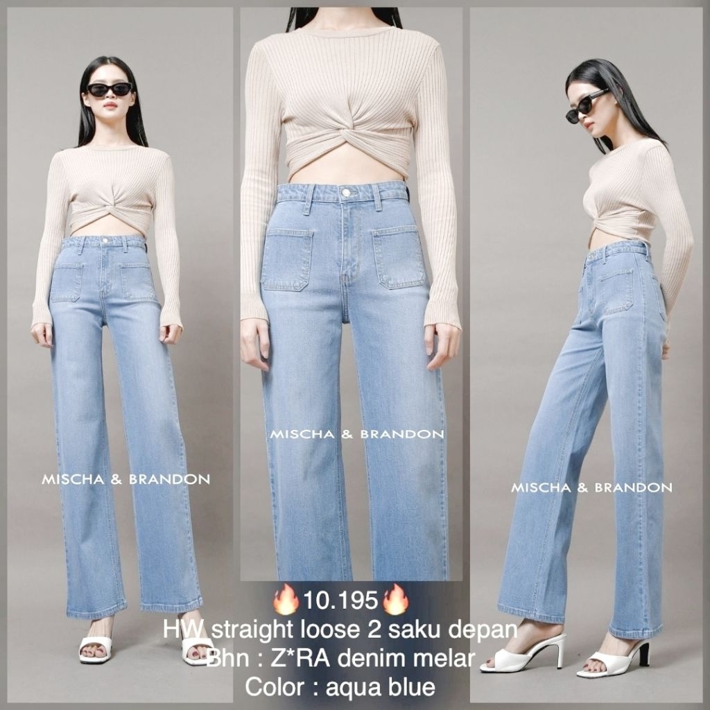 M&B Jeans Celana Panjang Wanita Jeans Stretch HW Straight Loose 2 Saku Depan Denim Melar