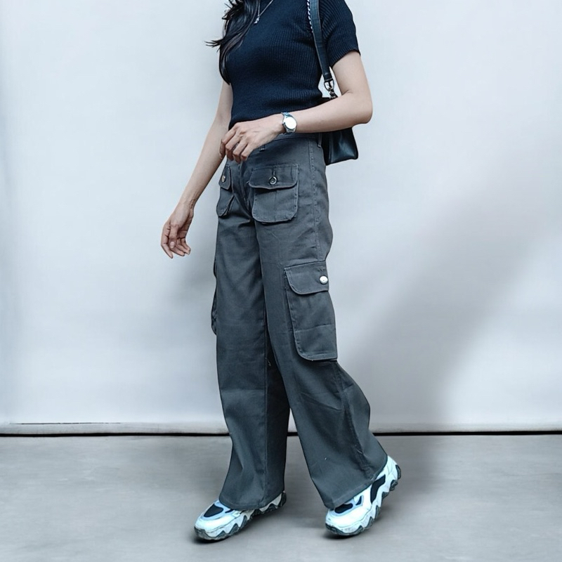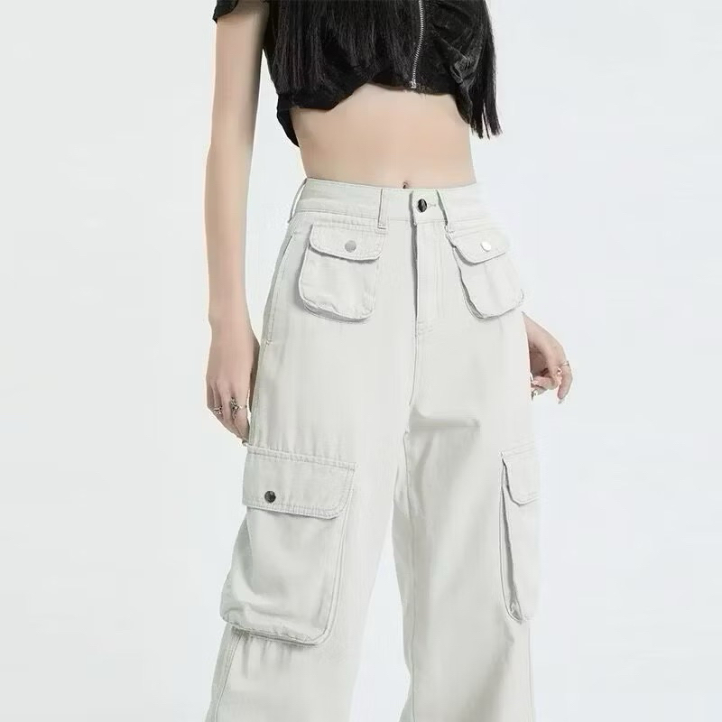 Celana Cargo Panjang Wanita Highwaist - Cargo Denim Pasir Putih Krem Cargo LULU