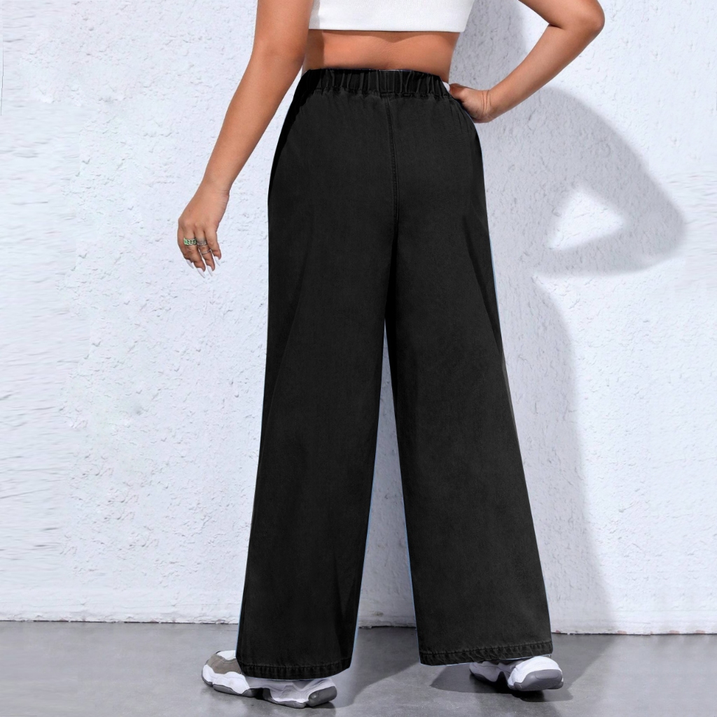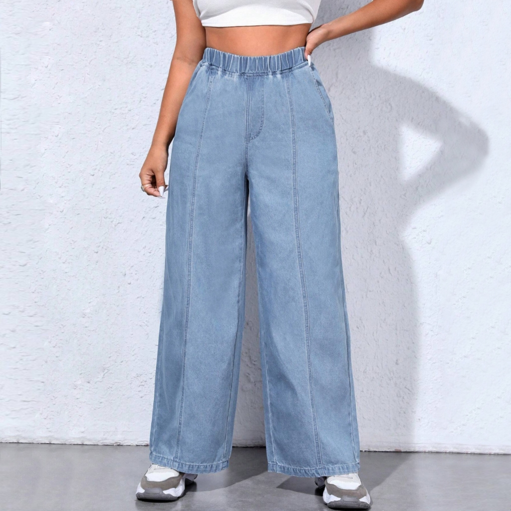 Celana Jeans Wanita Korean Style Seluar Straight Cut Wide Leg Elastic Waist Baggy Denim Jeans