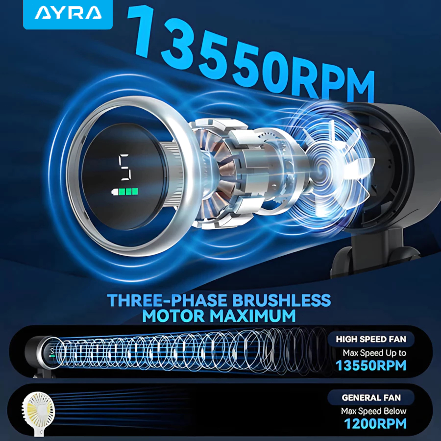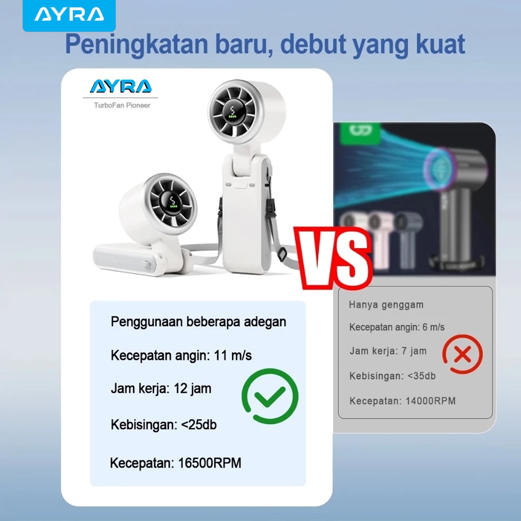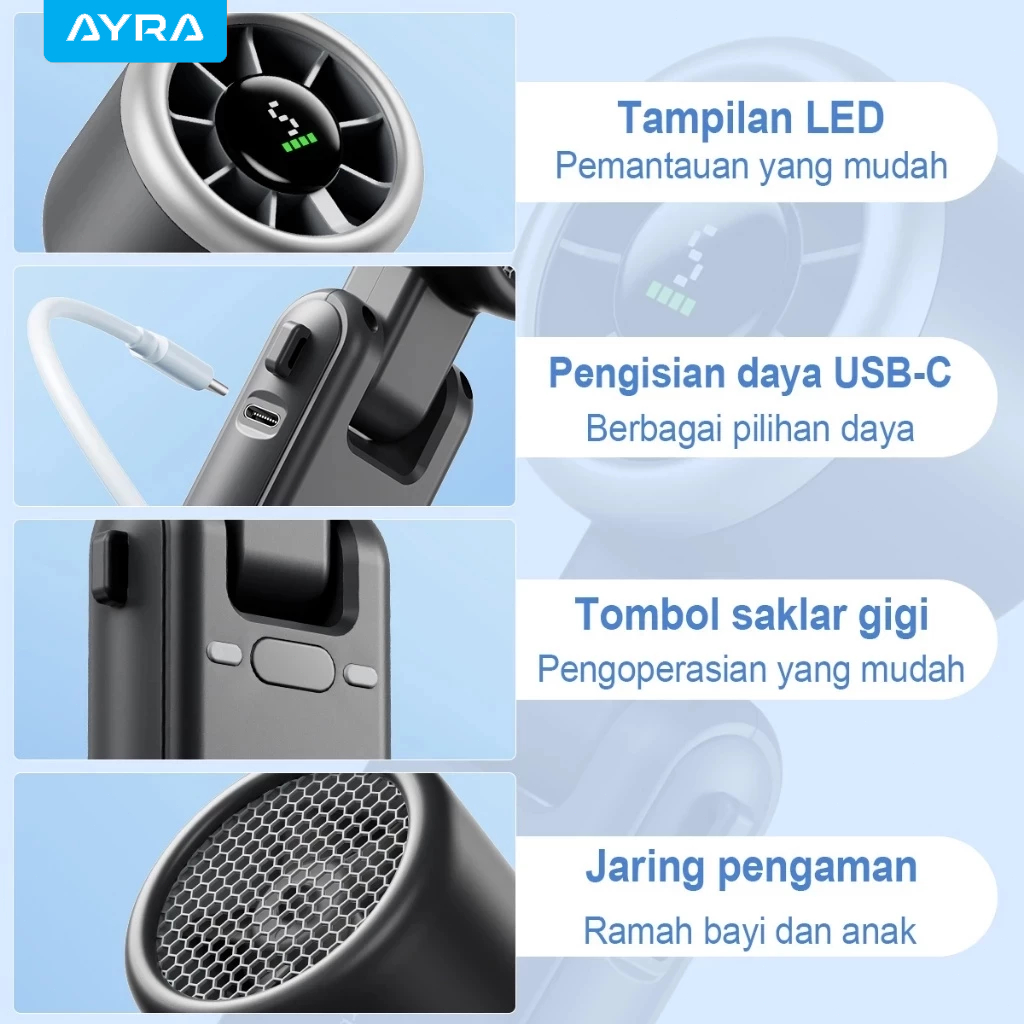 AYRA Mini Kipas Angin Portable Handheld Stand up Desktop Fan High speed Turbo Strong Wind Adjustable Digital Display USB Rechargeable
