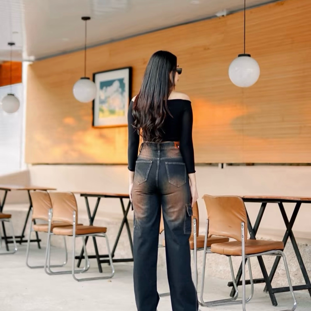 HighWaist Baggy Cargo Loose Jeans Retro Whisker - Celana Cargo Jeans Wanita Unisex