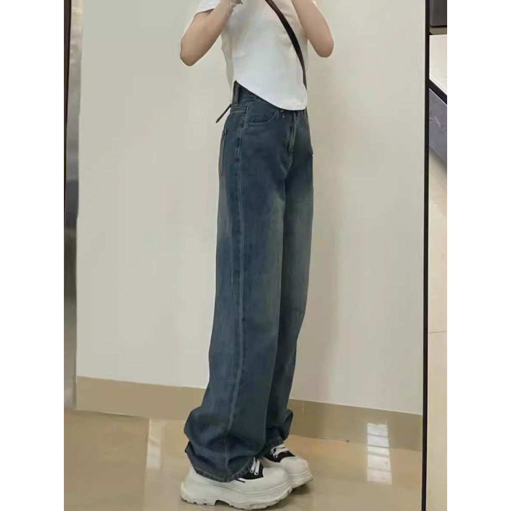 Biru retro Celana jeans wanita Premium Celana jeans lurus longgar ala Korea