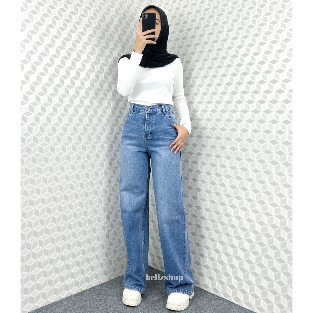 Celana Kulot Highwaist Jeans Panjang Wanita Tebal Tint Whisker Premium Bellzshop Sachi Size S-XXL