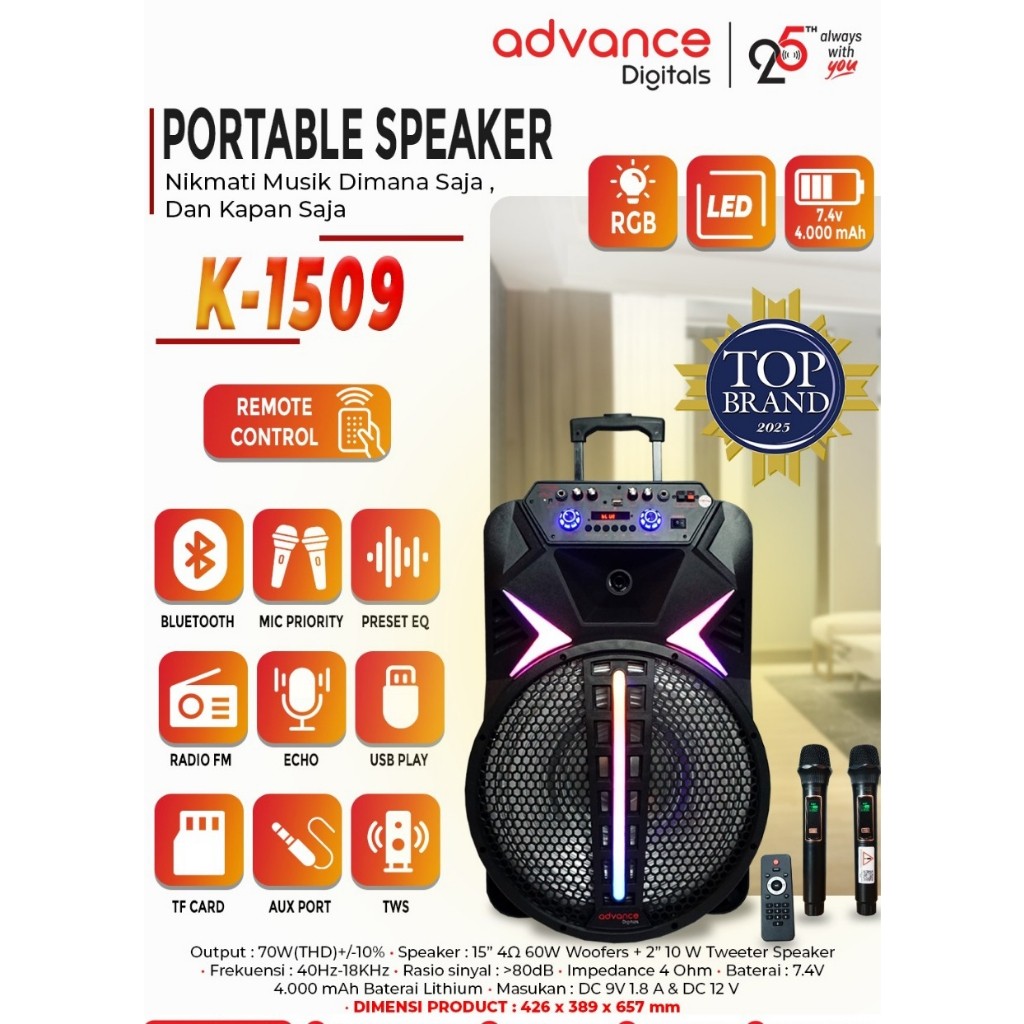 Advance K-1509 Speaker Portable Bluetooth Karaoke 15 inch dengan 2 Mic Wireless