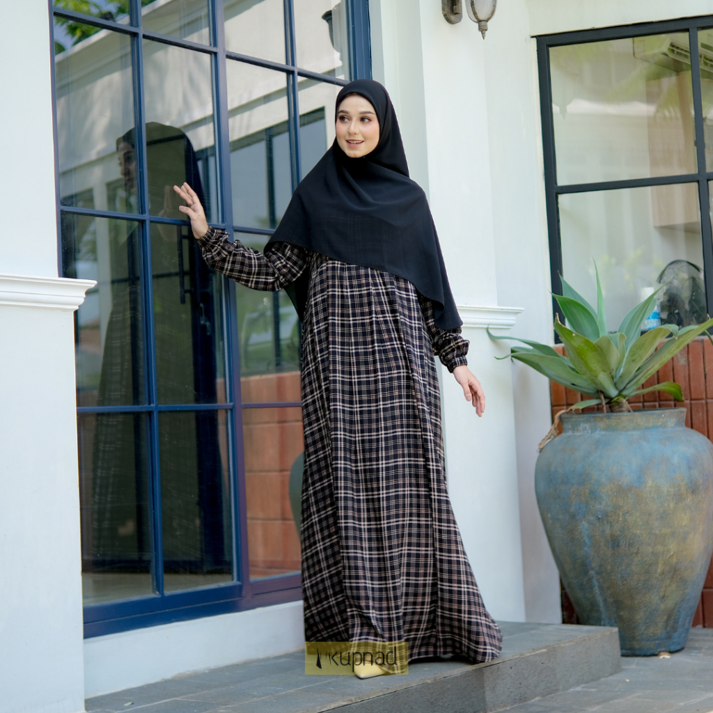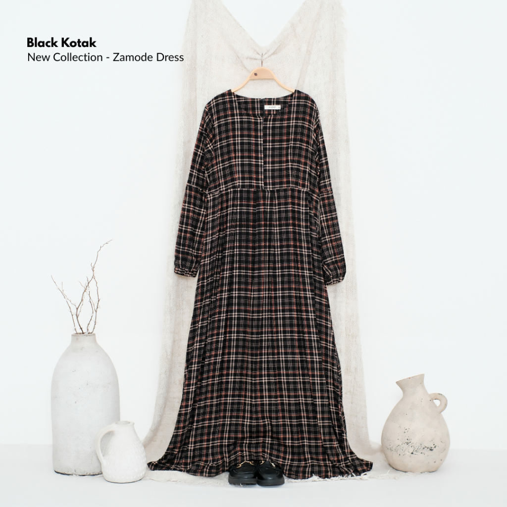 Gamis Motif Kotak Perempuan Daily Muslimah Syar’i Busui Friendly Adem, Modern & Nyaman | Zamode Dress Black Kotak