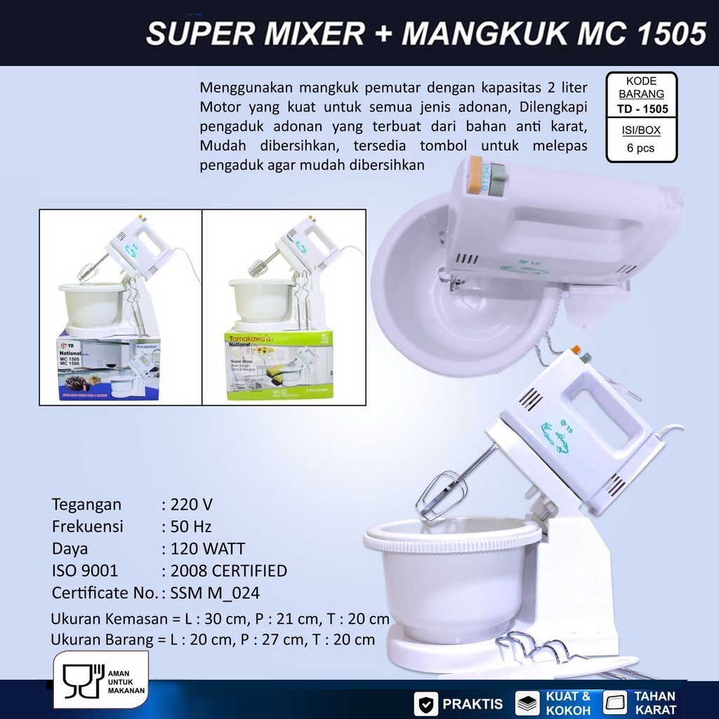 Mixer National MC 1506 Mangkok Putar 2 Liter - Stand Mixer Low Watt