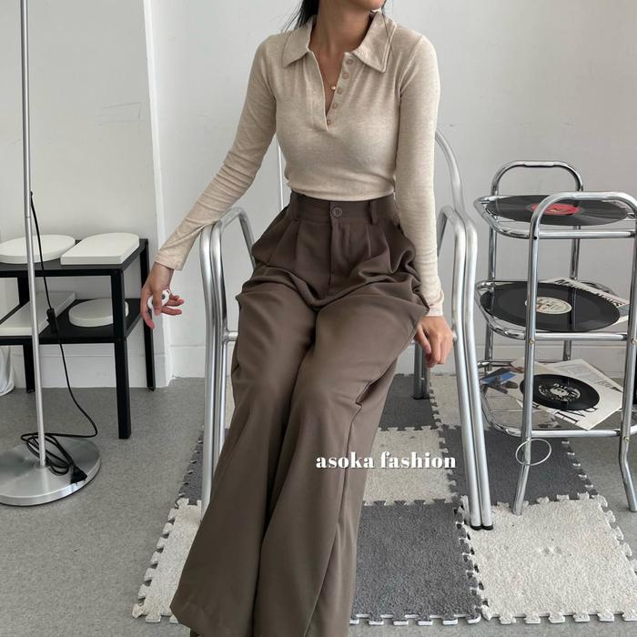 ASOKA Calliope Top 2148 - Kaos Crop Polo Knit - Kaos Wanita Lengan Panjang Baju Atasan - Grey