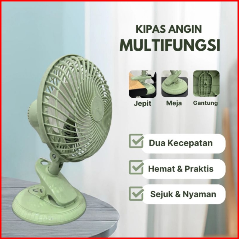 Kipas Angin Multi Fungsi Jepit Meja Duduk Dinding Tembok Muter Kiri Kanan Ukuran 8 Inch