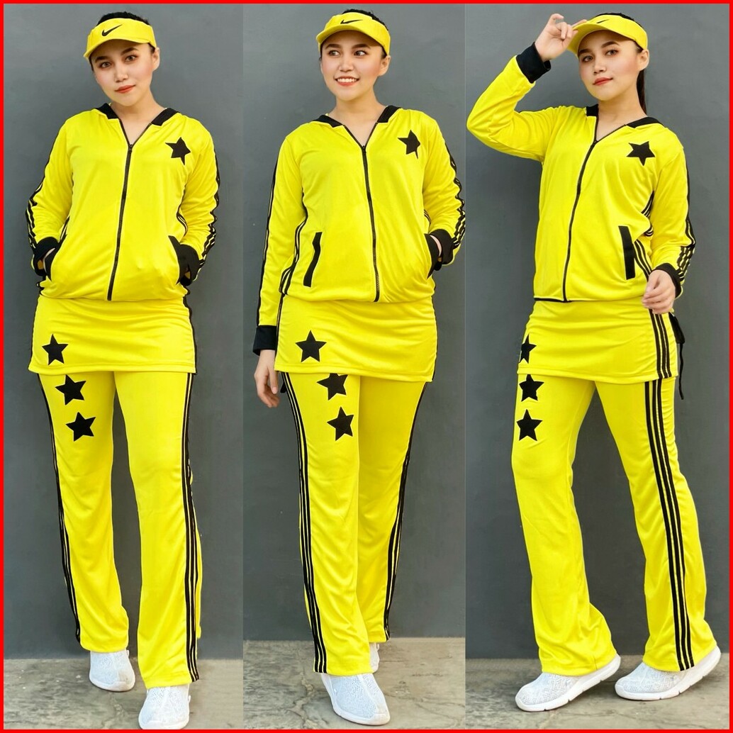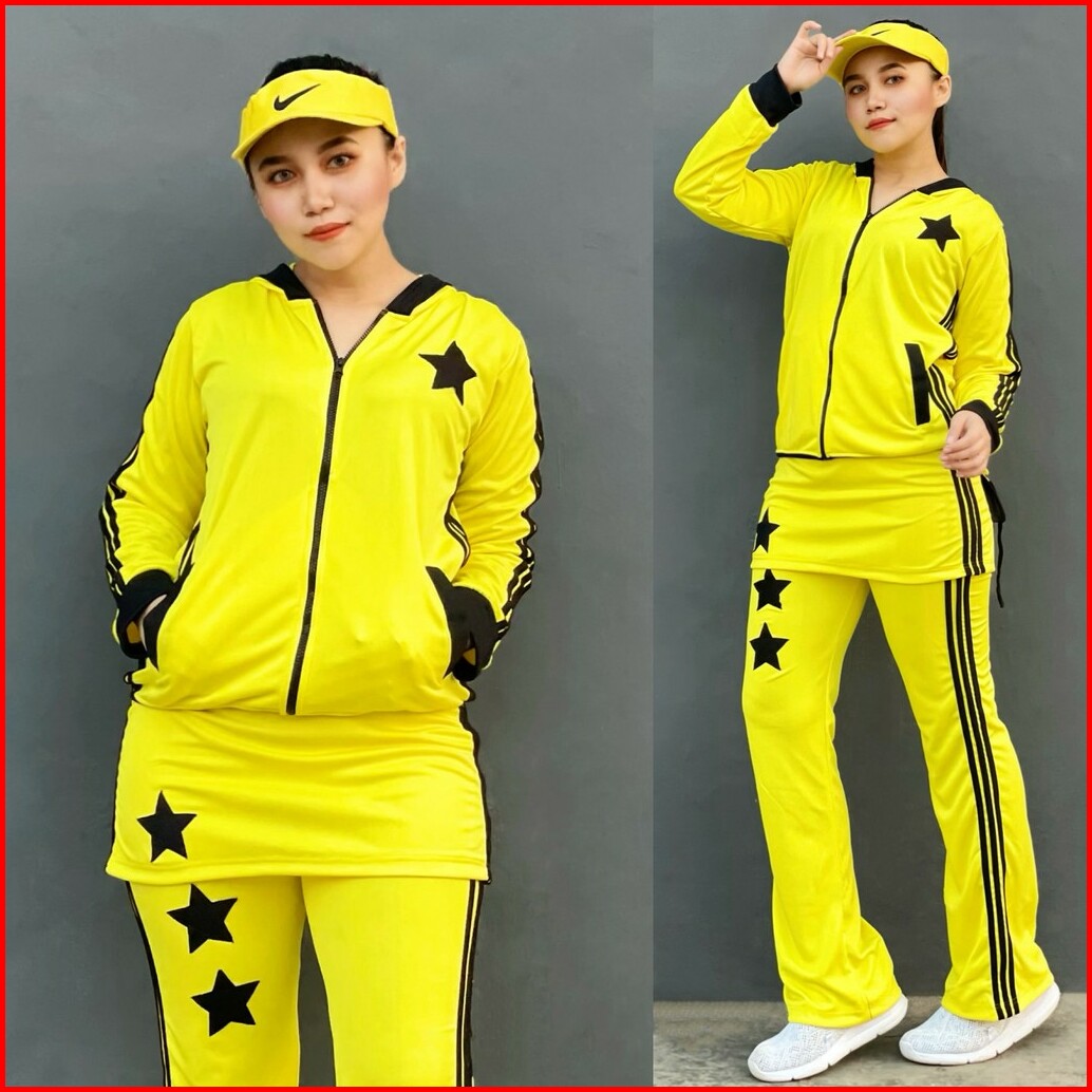 Baju Senam Aerobik Setelan Lapangan Zumba Olahraga Panjang Muslimah Hijab Cycling Rok Kuning Hitam