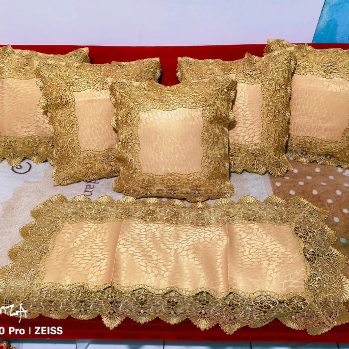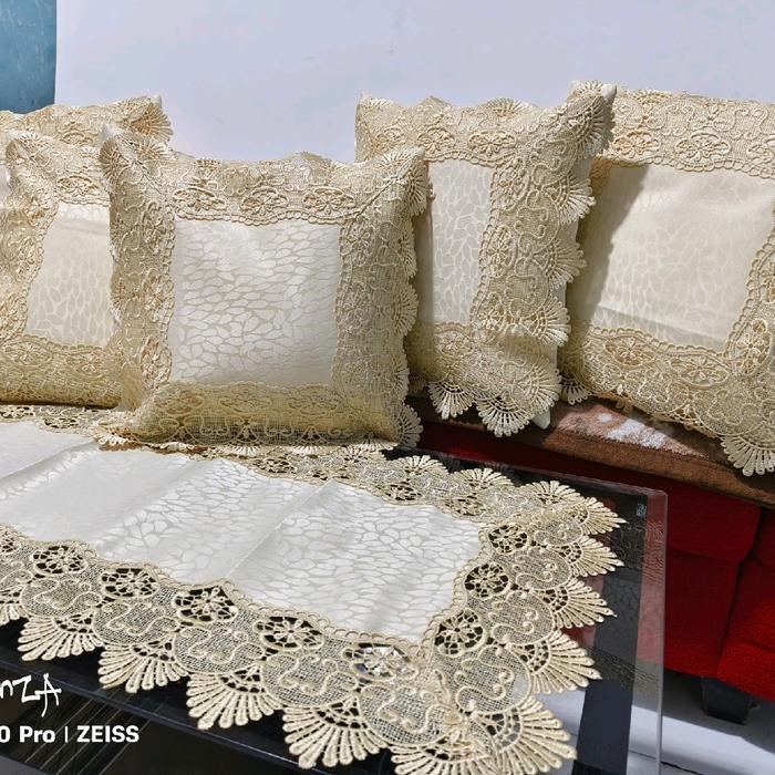 SATU SET 5 SARUNG BANTAL+1 TAPLAK MEJA TAMU BORDIR RENDA KERANCANG - 40*40 cm COKLAT BELUDRU
