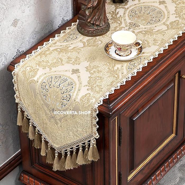 Taplak Meja Tamu Aesthetic Ottoman Table Runner Panjang Dekorasi Meja Makan Warna Gold - 35x160cm