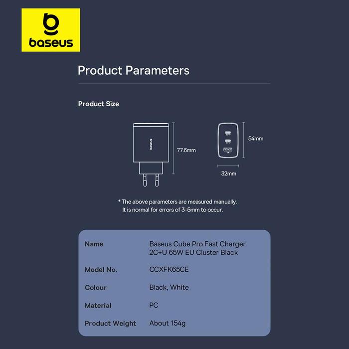 Baseus Cube Pro Fast Charger 2C+U 65W EU Kepala Charger White Black