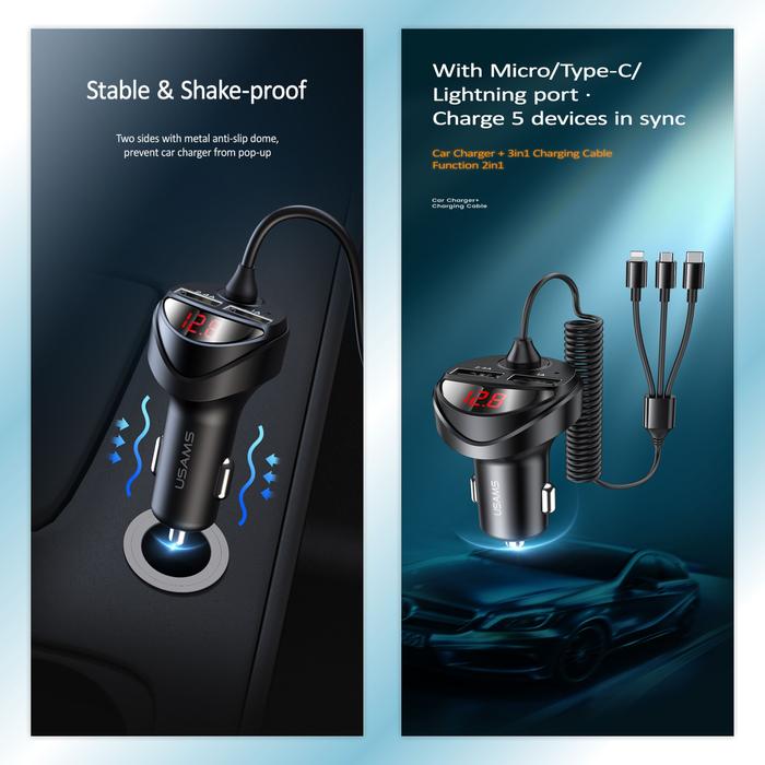 USAMS C22 Car Charger Mobil with 3IN1 Spring Cable Dual USB 3.4A Digital Display