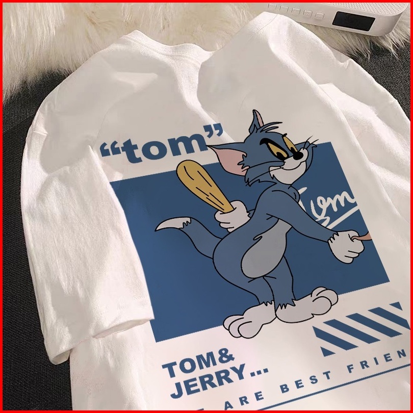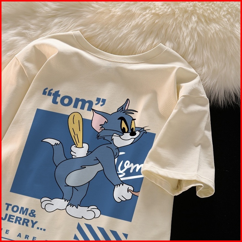 Cream Kaos Oversize Lengan Tom And Jerry Cartoon Katun Murni Korean Style Wanita Baju Atasan Wanita Terbaru