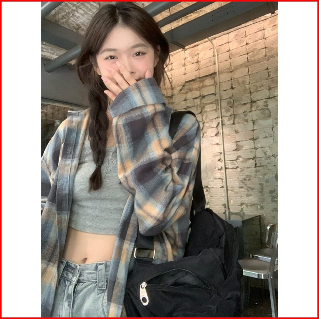S.y Kemeja Wanita Flanel Kotak Kotak Lengan Panjang Basic Oversize Retro Atasan Wanita