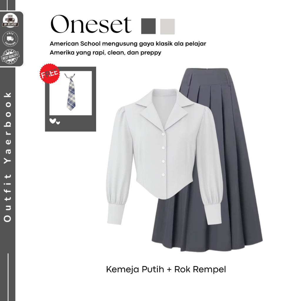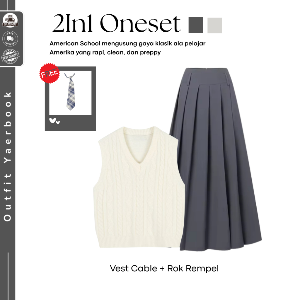 Setelan Wanita Yearbook American School (Vest Cable + Kemeja Puff + Rok Remple ) Ootd Yearbook Remaja - Fo29