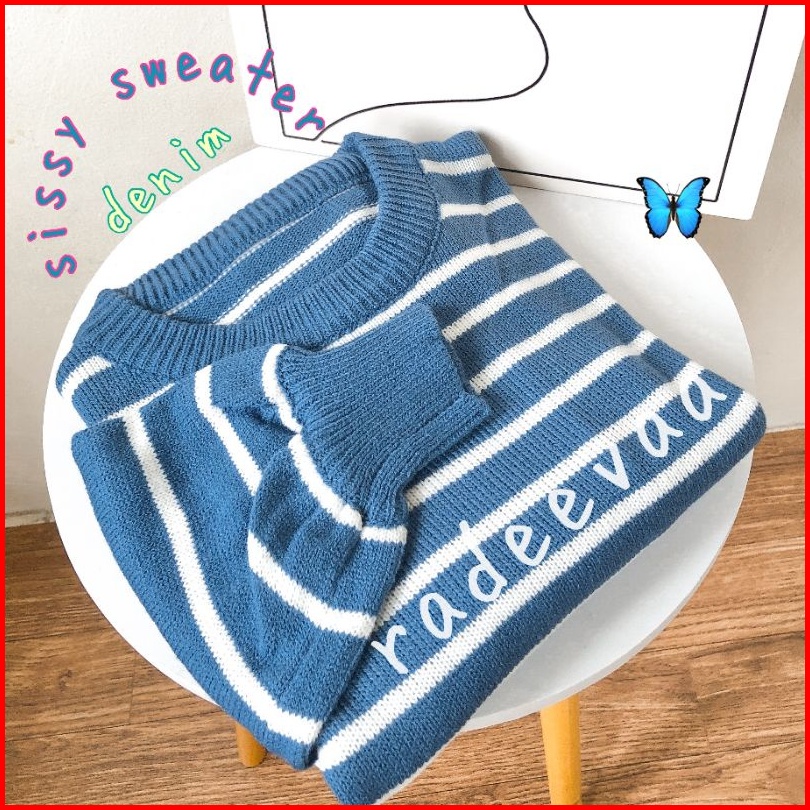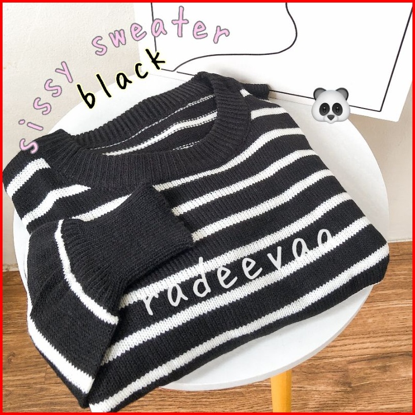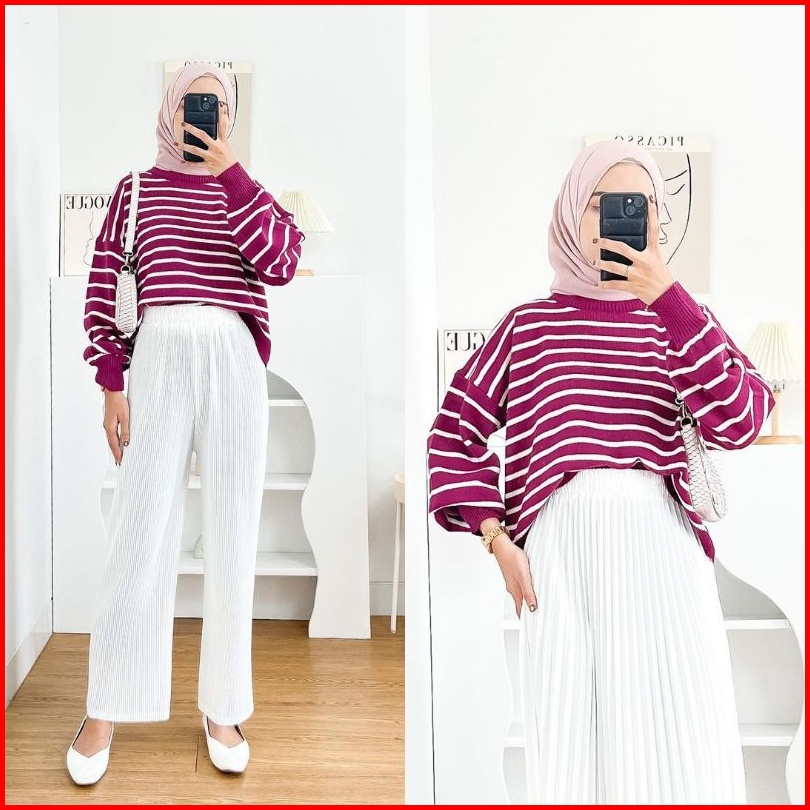 Sweater Knit Stripe Sissy Crop Atasan Rajut Motif Garis Oversize Tebal