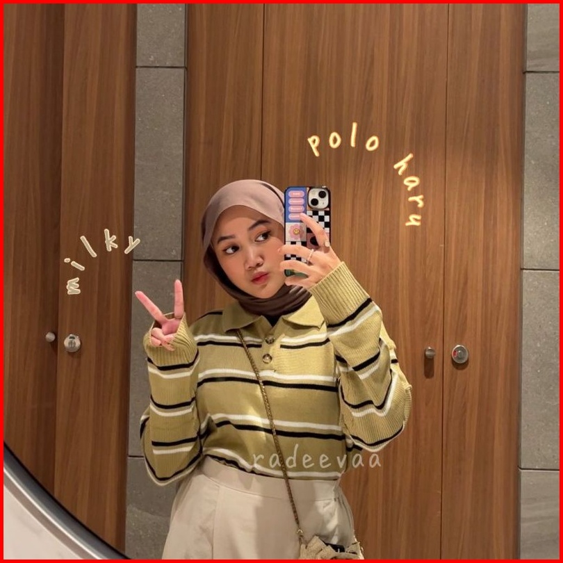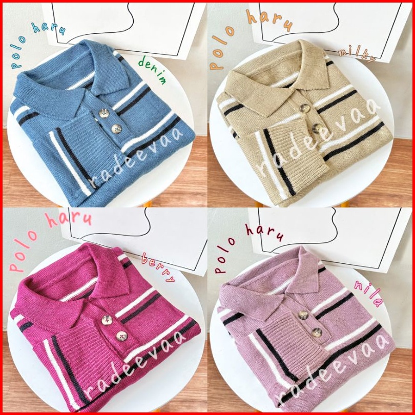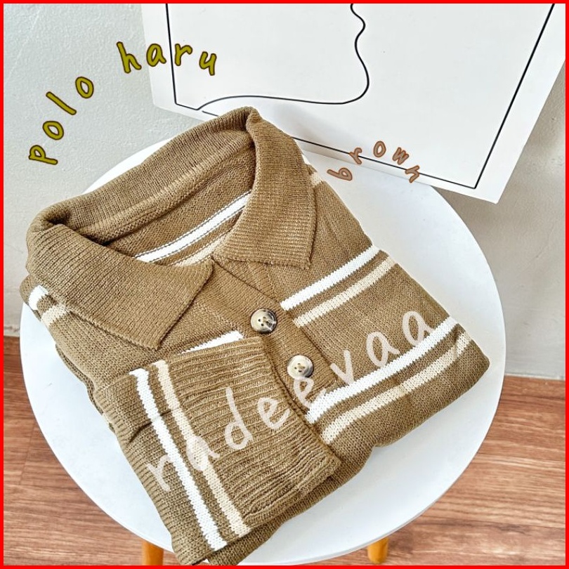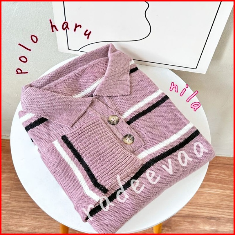 Sweater Knit Polo Haru Stripe Atasan Rajut Oversize Berkerah Kerah Motif Garis