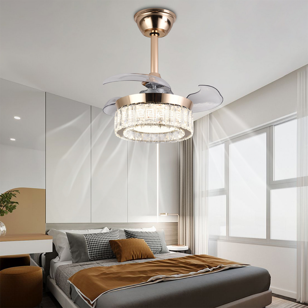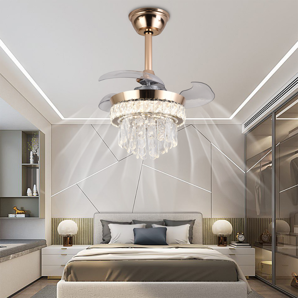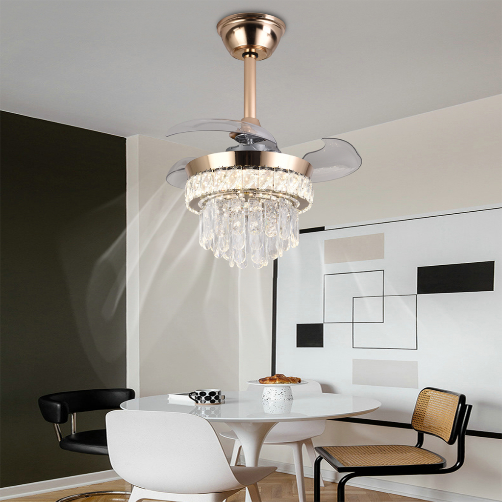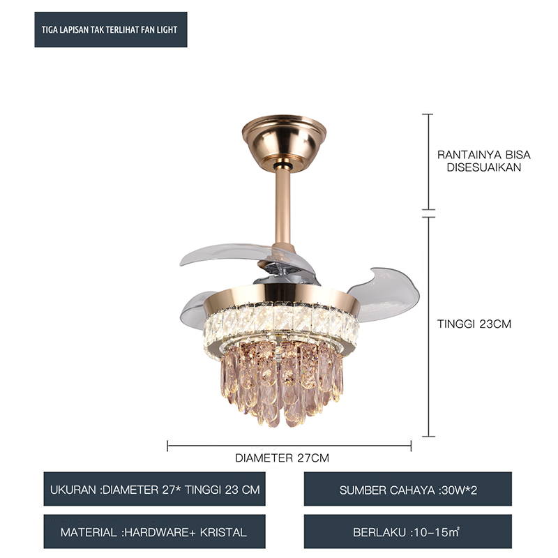 WANSAN Lampu Gantung Dengan Kipas yang Tidak Terlihat Mewah Cristal Lampu Emas Remote Control Untuk Ruang Tamu & Restor
