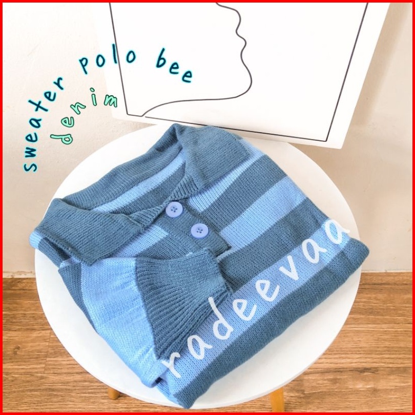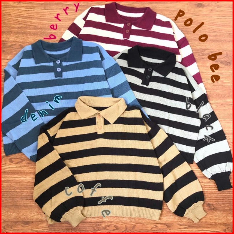 Sweater Polo Bee Knit Motif Garis Blaster Atasan Rajut Wanita Oversize Crop Korean